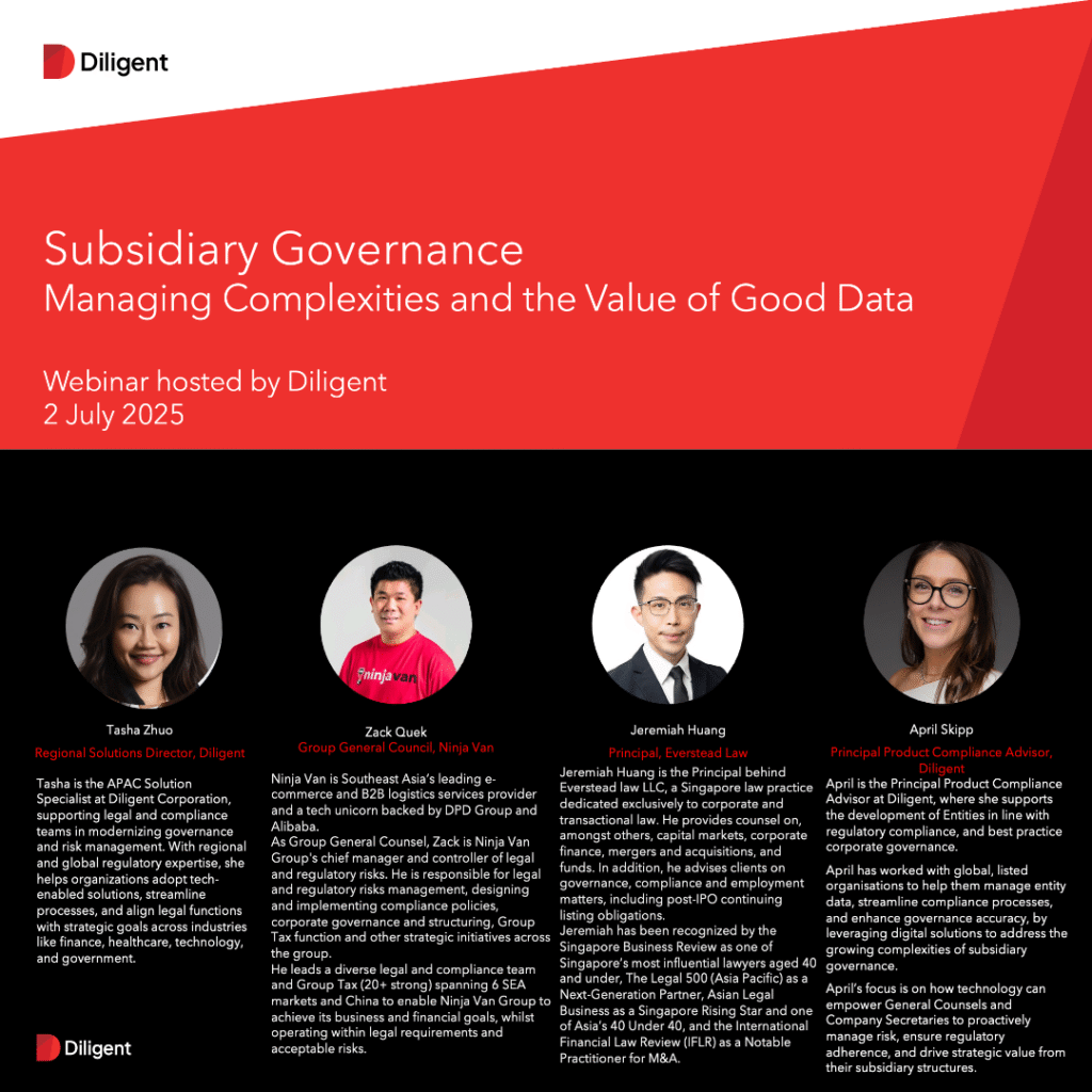 Global governance solutions leader Diligent hosted a webinar titled “Subsidiary Governance: Managing Complexities and the Value of Good Data”, followed…News, Thought Leadership