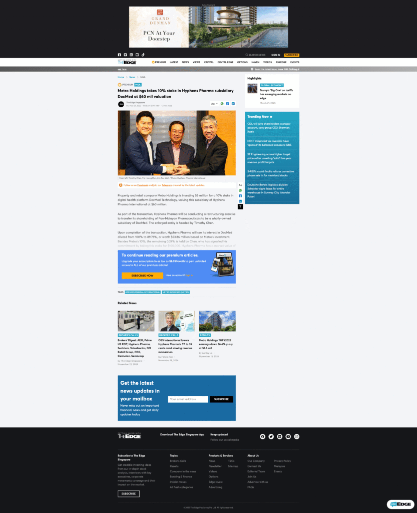 27.05.2022ZICO: Metro Invests S$6 million for 10% Stake in Hyphens Pharma’s Digital Healthtech Unit, DocMed Technology