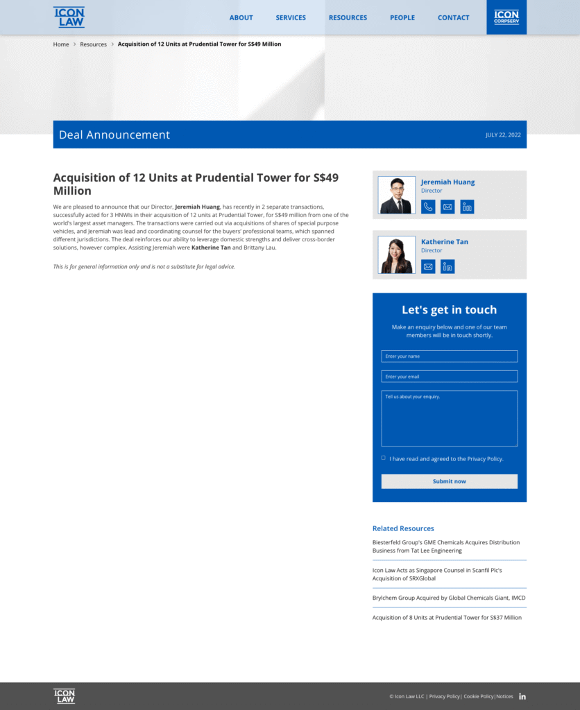 Acted for 2 HNWIs in their acquisition of 8 units in Prudential Tower, a Grade A commercial building in Singapore's…Deals & Transactions