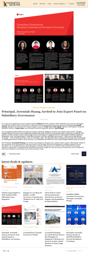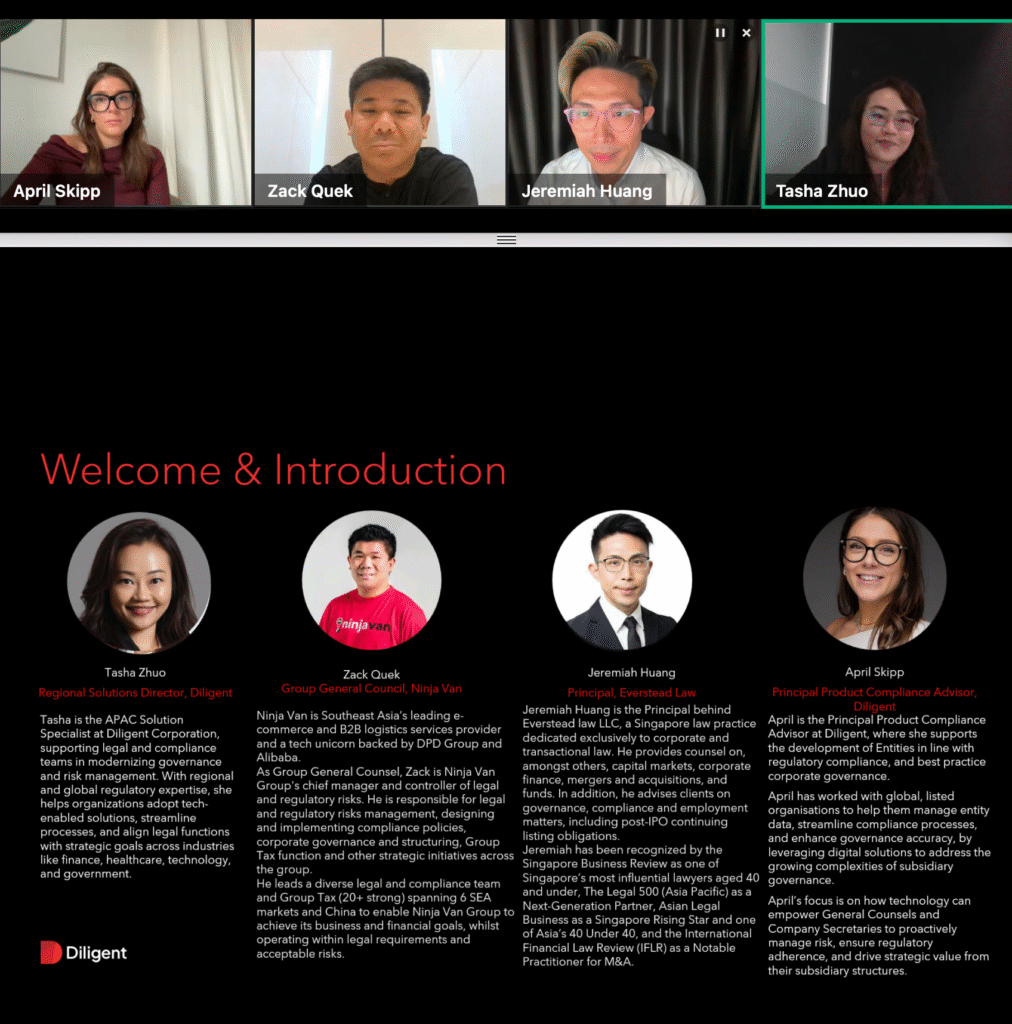 Global governance solutions leader Diligent hosted a webinar titled “Subsidiary Governance: Managing Complexities and the Value of Good Data”, followed by an expert panel discussion. I was invited to join the latter, alongside General Counsel of Asian logistics unicorn, Ninja Van, Zack Quek, together with Diligent’s Regional Solutions Director, Tasha Zhuo, and Principal Product Compliance Advisor, April Skipp.