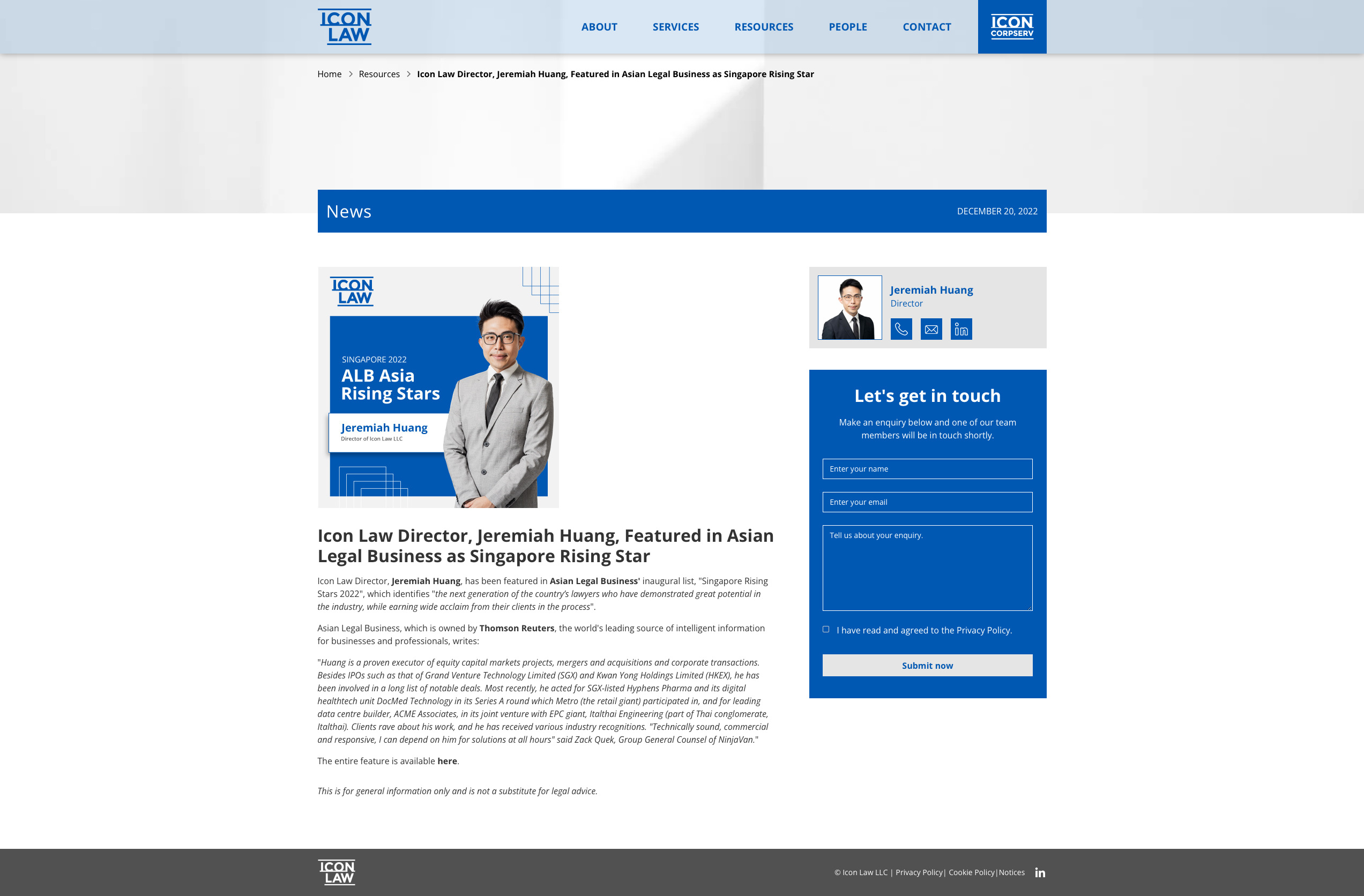 Featured in Asian Legal Business’ inaugural list, “Singapore Rising Stars”, which identifies “the next generation of the country’s lawyers who have demonstrated great potential in the industry, while earning wide acclaim from their clients in the process”. Asian Legal Business, which is owned by Thomson Reuters, the world’s leading source of intelligent information for businesses and professionals, writes: “Huang is a proven executor of equity capital markets projects, mergers and acquisitions and corporate transactions. Besides IPOs such as that of Grand Venture Technology Limited (SGX) and Kwan Yong Holdings Limited (HKEX), he has been involved in a long list of notable deals. Most recently, he acted for SGX-listed Hyphens Pharma and its digital healthtech unit DocMed Technology in its Series A round which Metro (the retail giant) participated in, and for leading data centre builder, ACME Associates, in its joint venture with EPC giant, Italthai Engineering (part of Thai conglomerate, Italthai). Clients rave about his work, and he has received various industry recognitions. “Technically sound, commercial and responsive, I can depend on him for solutions at all hours” said Zack Quek, Group General Counsel of NinjaVan.”