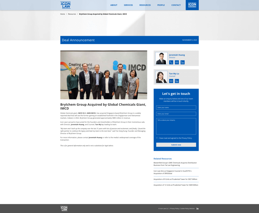 Acted for Singapore-based Brylchem Group in a widely reported deal that will see listed global chemicals giant, IMCD, acquiring an established foothold in the Singaporean and Vietnamese markets. Indeed, in 2022, Brylchem Group generated approximately S$85 million in revenue.