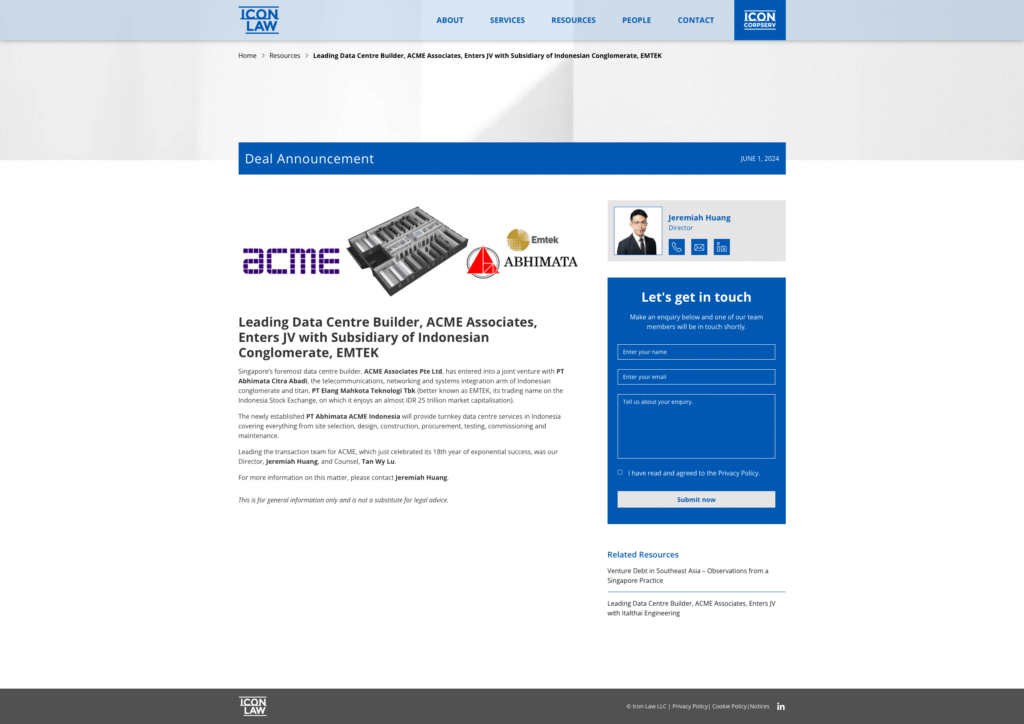 Advised Singapore’s leading data centre builder, ACME Associates, on its new chapter in Thailand, with the establishment of a joint…Deals & Transactions