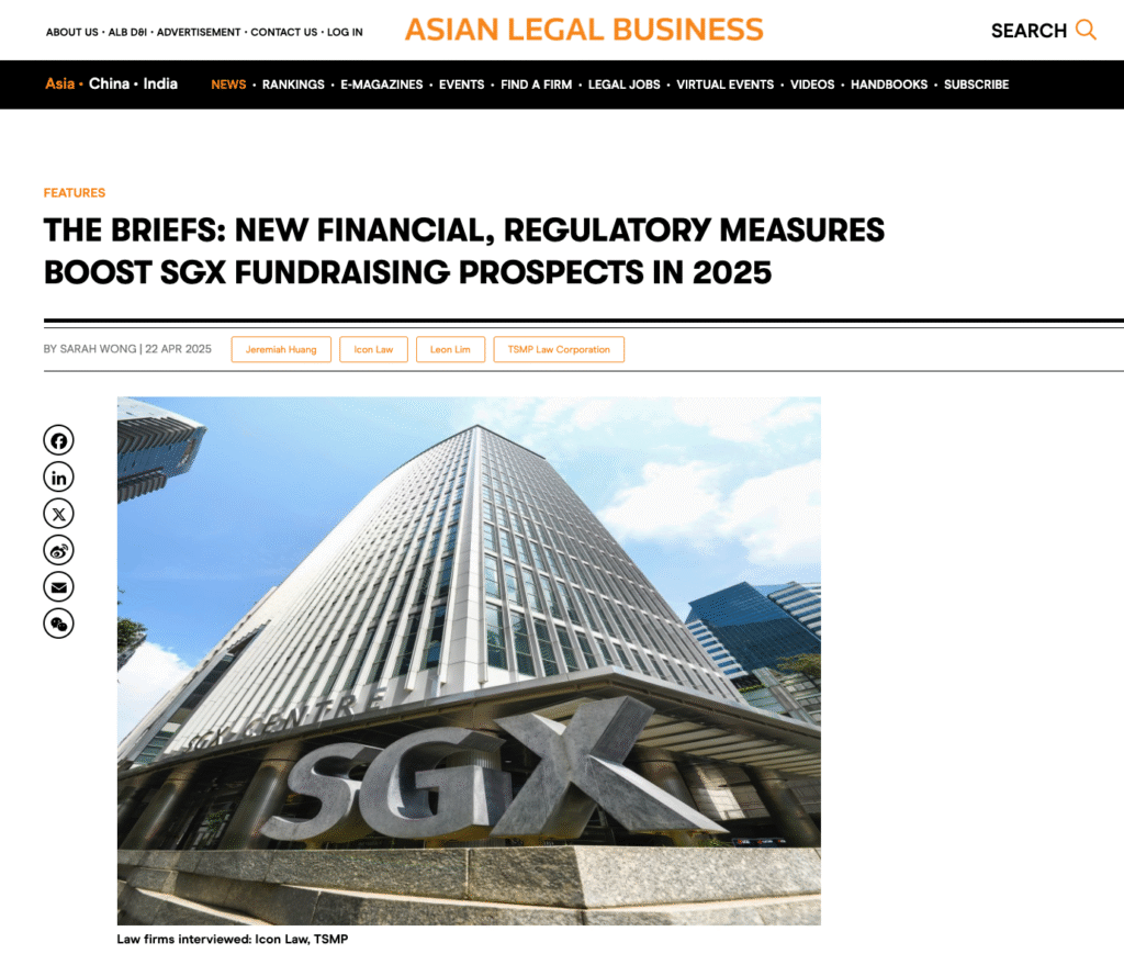 25.04.2025Icon: Shared Thoughts in Asian Legal Business’ Feature on Measures to Boost Singapore’s Equity Capital Markets