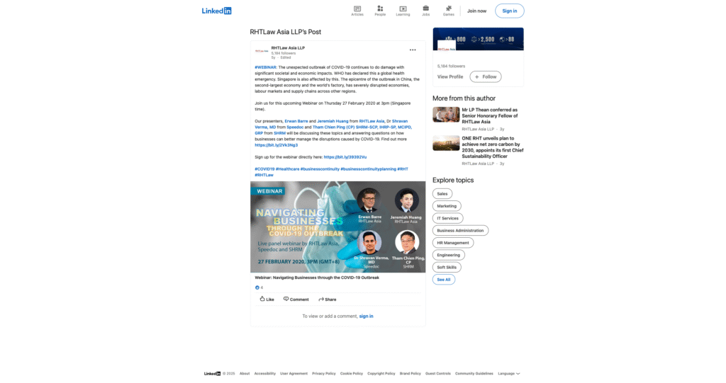 Invited to participate as a legal expert in the French Chamber Singapore's webinar on adapting business to COVID.News, Thought Leadership